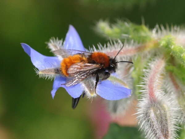 Hunnene har en flammerød bakkropp og mellomkropp med tydelig pels, mens beina og hodet er hårete og svart. På grunn av fargen kan denne sandbia forveksles med hornmurerbia, men fargen på beina skiller dem.
